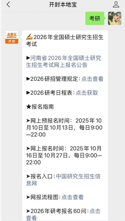 温馨提示:微信搜索公众号【开封本地宝】,关注后在对话框回复【考研】获取2026考研最新政策/消息、研考日程表、考研预报名/报名时间和入口、报名流程、考试指南等